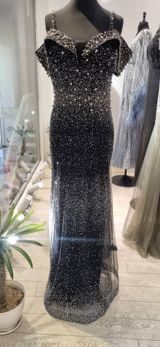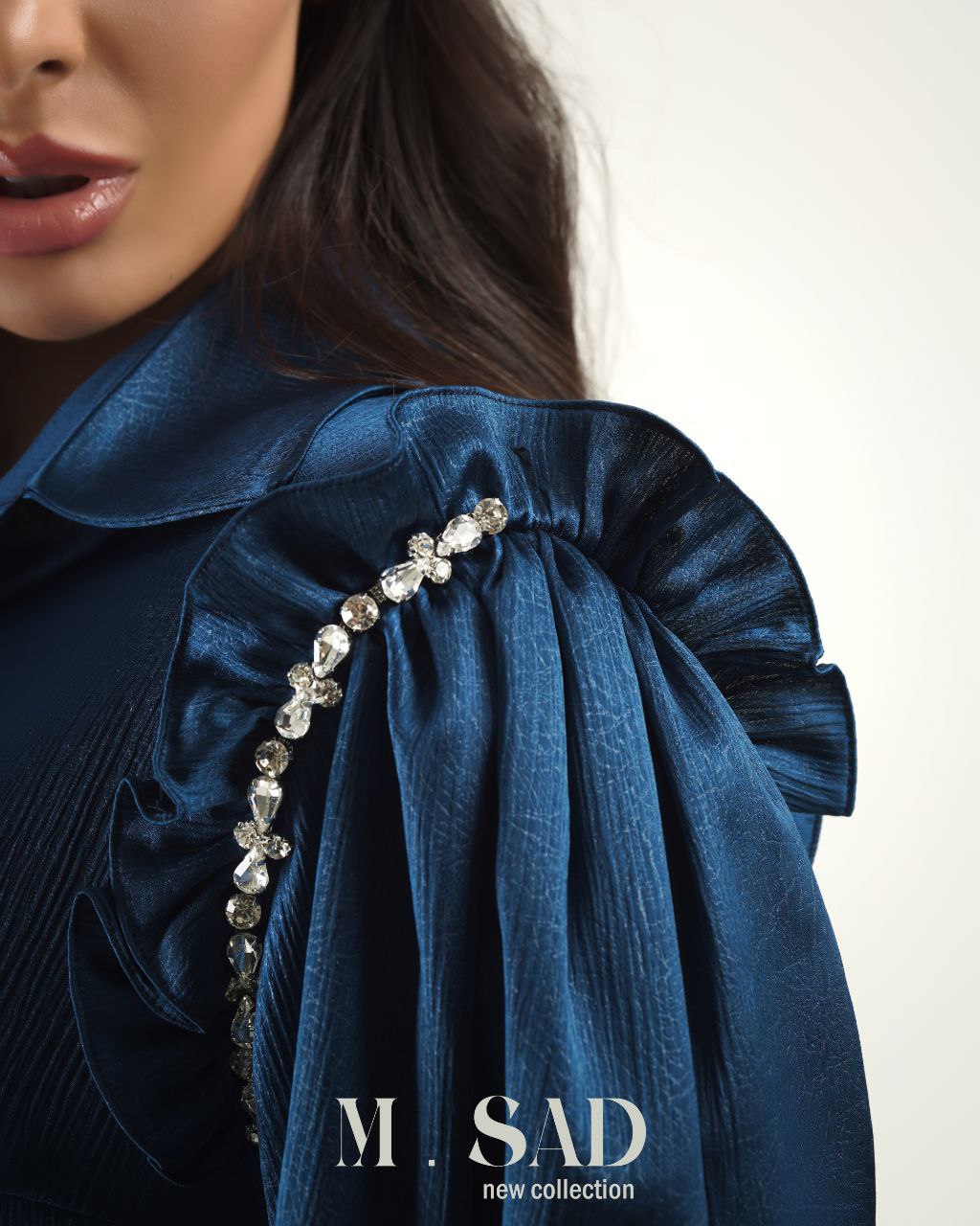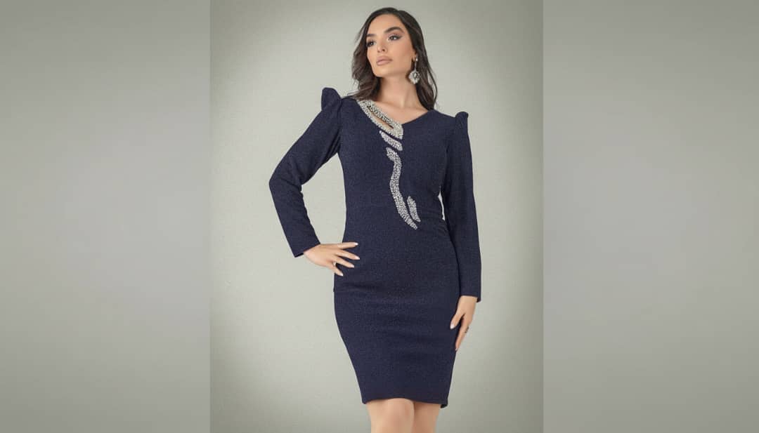 لباس مجلسی میدی سرمه‌ای با سنگ‌کاری ظریف و آستین بلند