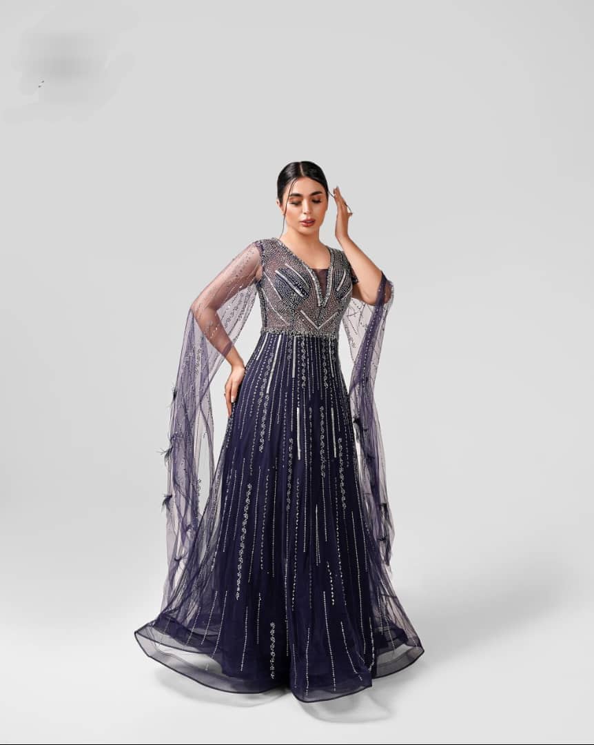 لباس مجلسی نقره‌ای‑آبی با منجوق، ملیله و پولک‌دوزی — مدل آستین‌پر دار